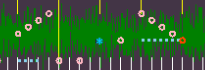 如下图,在ラグトレイン[MAS]中段出现了一条慢 SLIDE(用于模拟“延误列车”),在慢 SLIDE 的运动过程中,上方四个键出现了许多散点。可以认为,对于相当一部分玩家,尤其是相当一部分推13阶段的玩家而言,此处的散点几乎总是需要用双手接的。而由于舞萌的 SLIDE 判定机制,玩家的手并不需要在完整过程中跟着 SLIDE 运动,只要玩家在接散点的过程中抽空摸掉slide的尾巴,就可以正常通过这段配置。